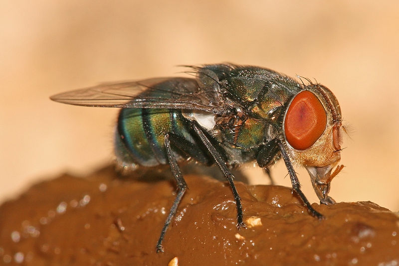 A female Chrysomya megacephala feeding on faeces. Pictured in Dar es Salaam, Tanzania (Picture courtesy of Muhammad Mahdi Karim)